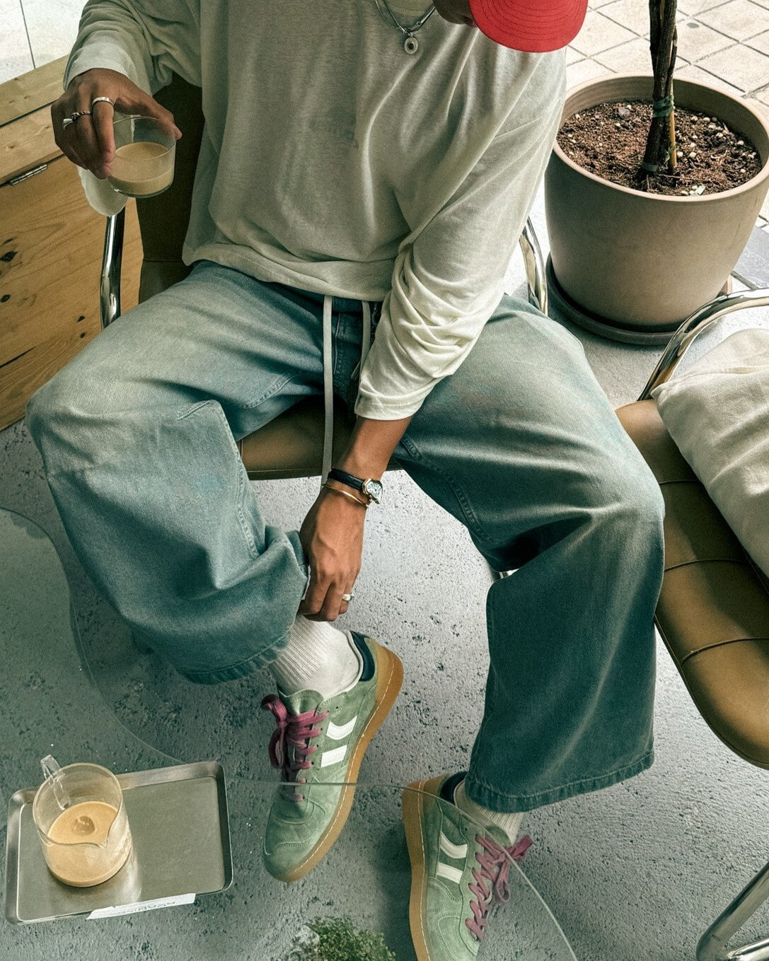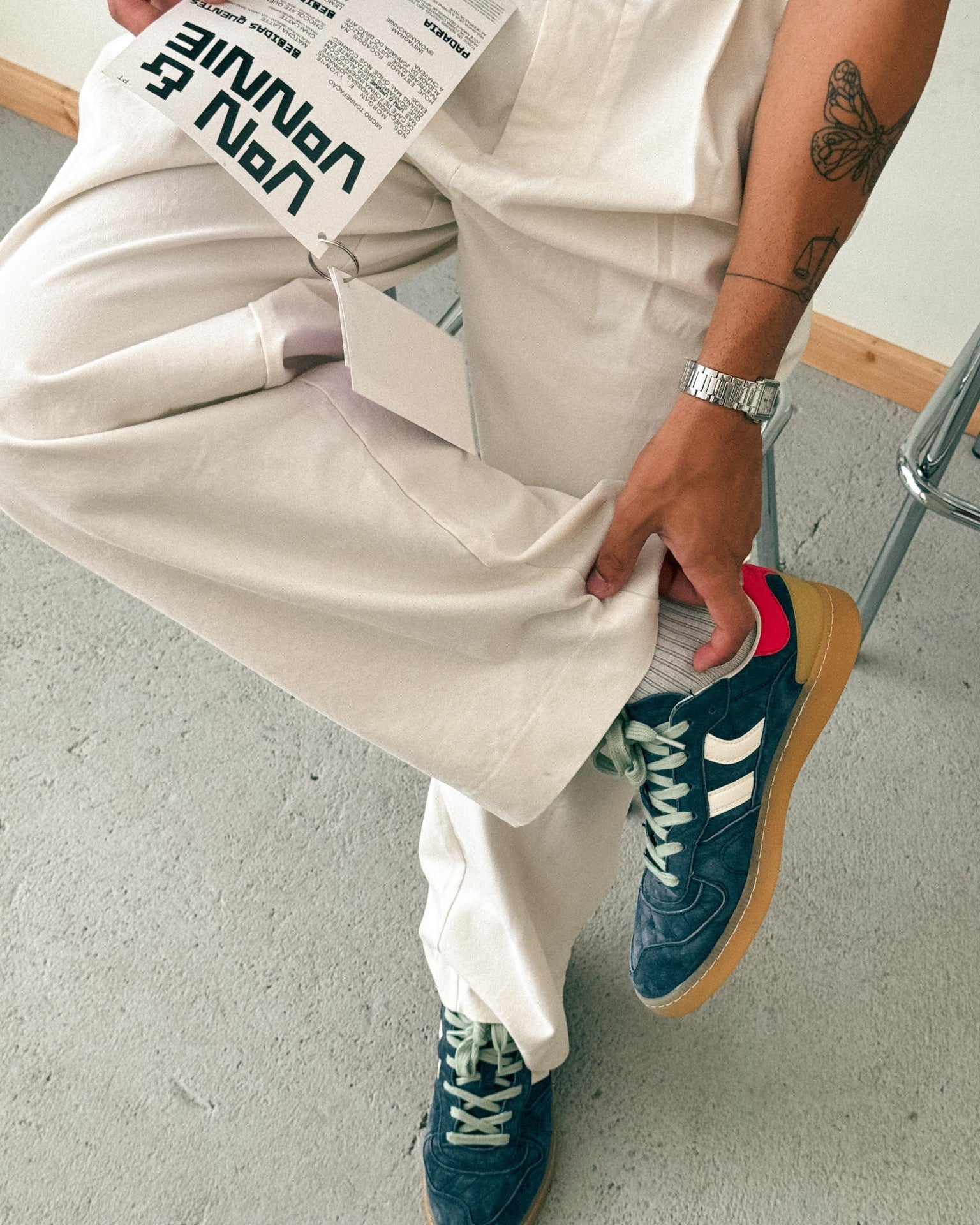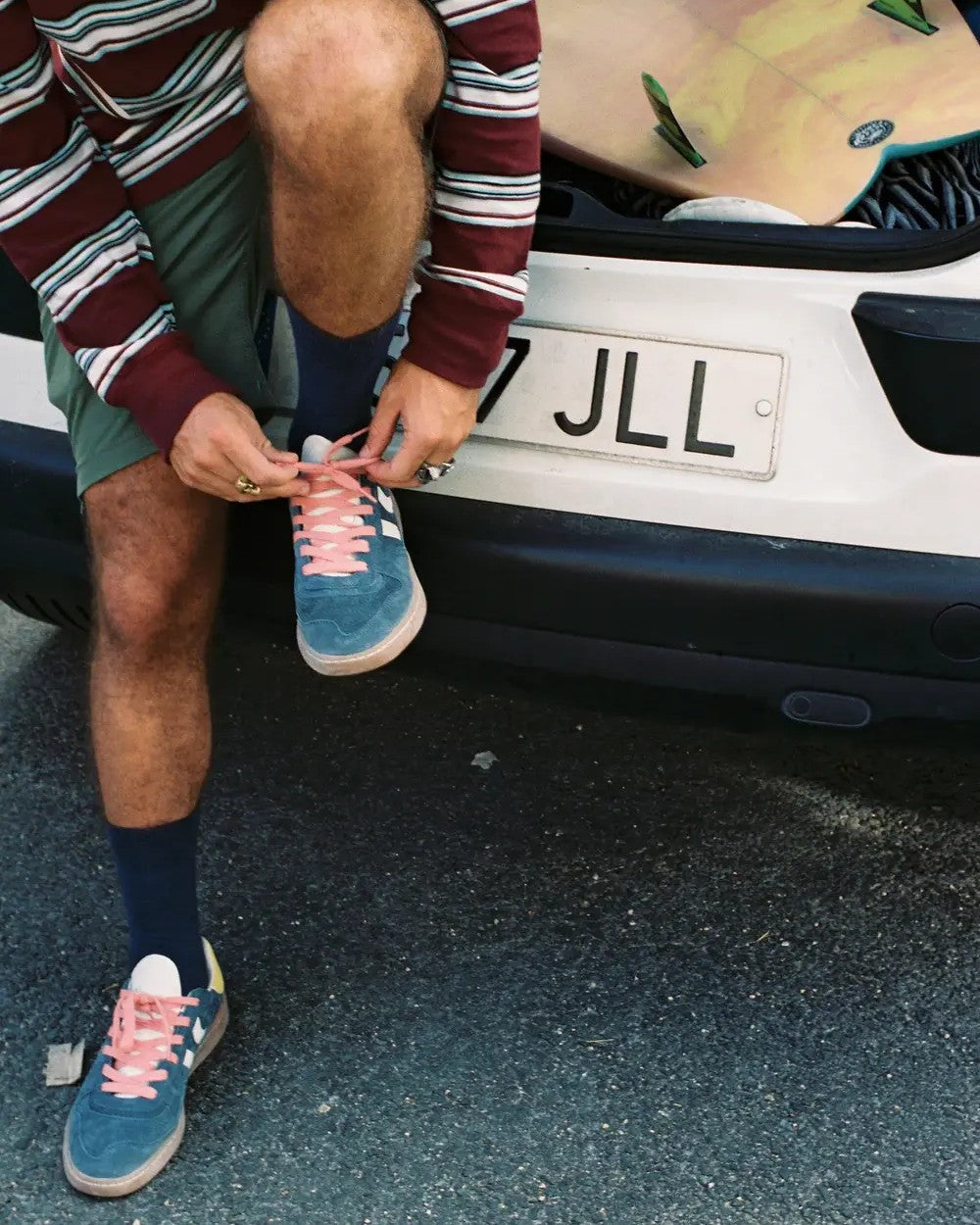 Suede sports shoe with contrasting color details. Leather and preformed tongue with figured padding. Views of the leather lining. Interchangeable two-tone flat cotton laces. Lightly padded collar. The front part has a stitching reinforcement. Flexible rubber/rubber sole that provides durability and grip. It has the model name “GOAL” on the side in old gold.